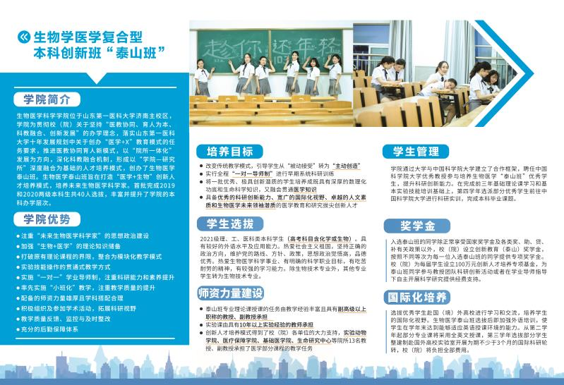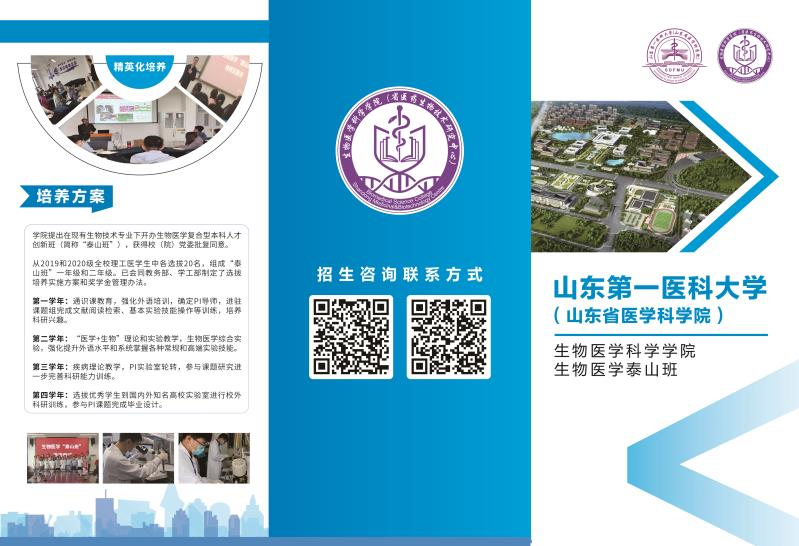 为进一步提升本科教学质量和办学特色,我院将于今年在全校范围的医、工、理科学生中选拔20名左右大一新生组建生物医学泰山班,旨在通过“小班制、精英化”教育模式,培养具有国际视野、能够引领未来医学科学研究发展的优秀人才和未来医学科学家,(详见宣传页)。