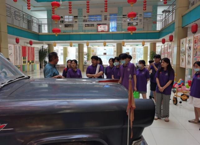 服务队在诸城市青少年宫受到老师与小朋友们的热烈欢迎。走进青少年宫,映入眼帘的便是具有纪念意义、我国有编号的第一批真正的红旗牌高级轿车——红旗CA72,青少年宫负责人向队员们详细讲述了这辆轿车的历史和它背后的故事,介绍了诸城市青少年宫的发展历程,并带领同学们参观了教学和活动场所。少年宫里处处可见小朋友们的精美作品,洋溢着青春的气息,彰显了少年们朝气蓬勃的精神面貌。
