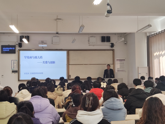 学院常务副院长崔亚洲为2021级的同学们开展了以《罕见病与孤儿药——关爱与创新》为主题的思政课,崔院长讲授了罕见病的特征、罕见病与常见多发病、罕见病防治等内容,让同学们对罕见病以及罕见病群体有了更加全面的认识,引导同学们为那些患有罕见病的人提供更多的关注和支持,鼓励同学们发挥好专业优势,积极投身罕见病研究,为维护人民生命健康贡献更多的力量。